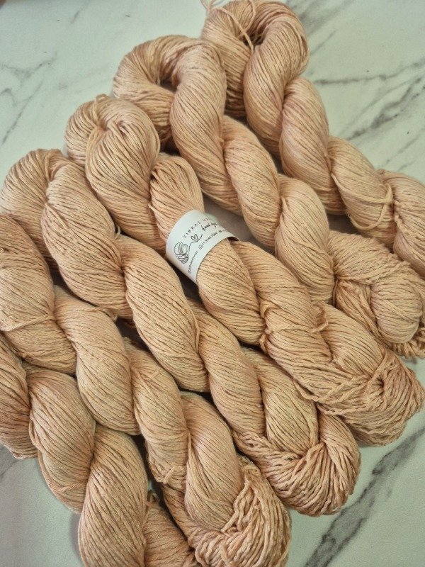Esta base es un blem de 50 % fibra de algodón peinado y 50 % fibra de bamboo . Tiene una mano exquisita. Es fresca y brillos a la vez. El algodón le otorga agarre y te permite fluir en el tejido mientras que el bamboo provee frescura y suntuosidad. Grosor fingering, 430 metros en 100 gramos. Partida tintada con carozos de Palta, tinte natural, modificado con bicarbonato de sodio. Presentacion en madejas de 100 gramos.