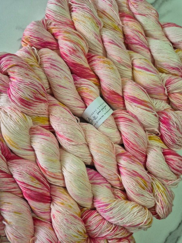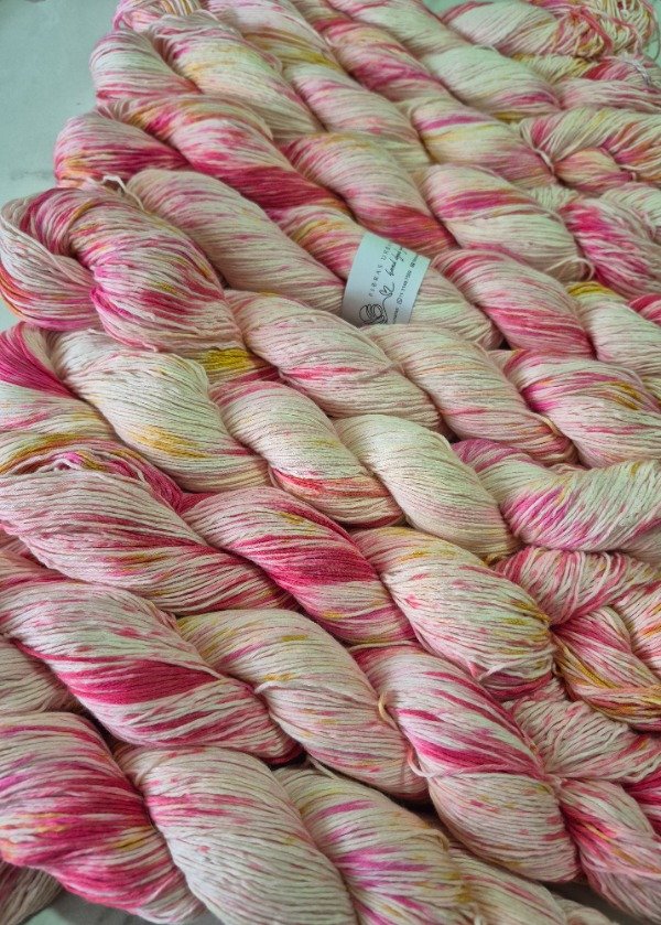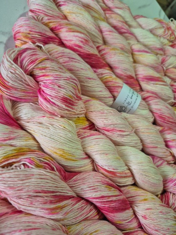 Esta base es un blem de 50 % fibra de algodón peinado y 50 % fibra de bamboo . Tiene una mano exquisita. Es fresca y brillosa a la vez. El algodón le otorga agarre y te permite fluir en el tejido mientras que el bamboo provee frescura, suntuosidad y brillo. Grosor fingering, 430 metros en 100 gramos.