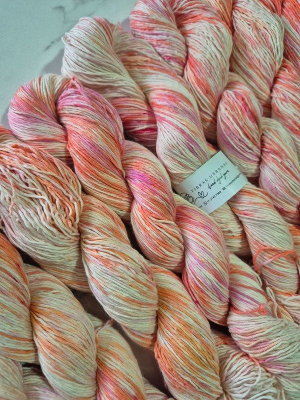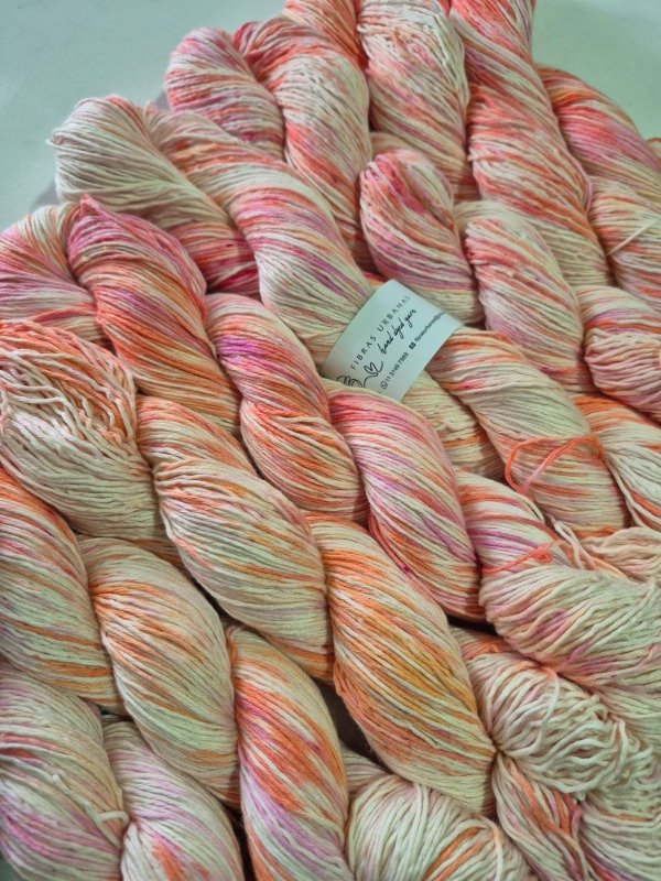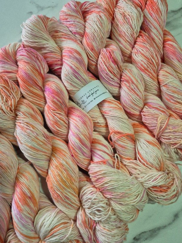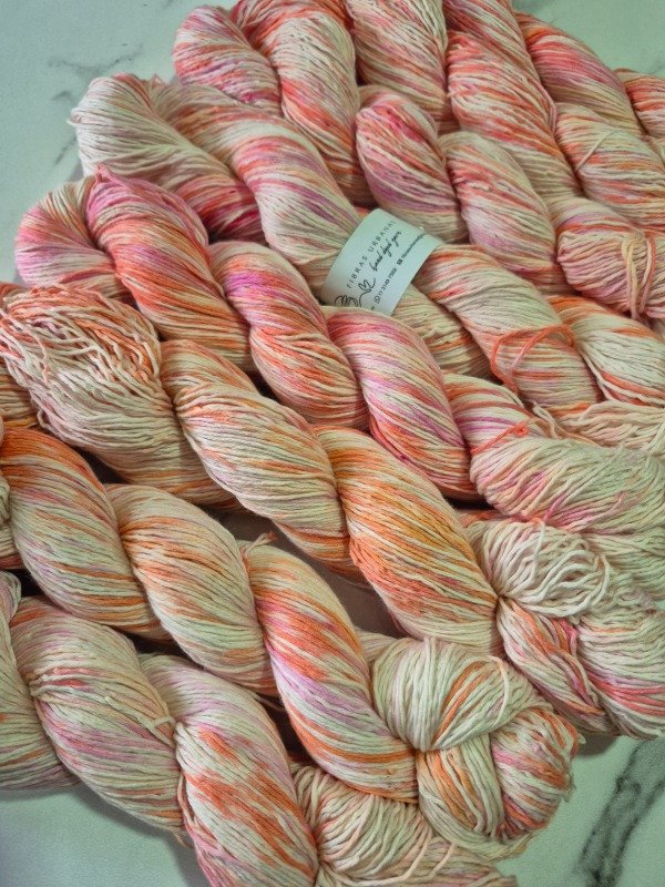 Esta base es un blem de 50 % fibra de algodón peinado y 50 % fibra de bamboo . Tiene una mano exquisita. Es fresca y brillosa a la vez. El algodón le otorga agarre y te permite fluir en el tejido mientras que el bamboo provee frescura, suntuosidad y brillo. Grosor fingering, 430 metros en 100 gramos.
