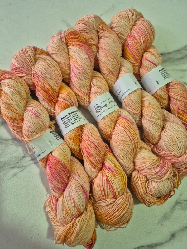 Esta base es un blem de 50 % fibra de algodón peinado y 50 % fibra de bamboo . Tiene una mano exquisita. Es fresca y brillosa a la vez. El algodón le otorga agarre y te permite fluir en el tejido mientras que el bamboo provee frescura, suntuosidad y brillo. Grosor fingering, 430 metros en 100 gramos.