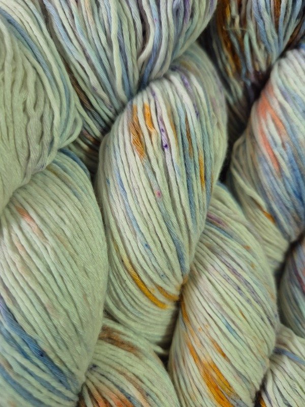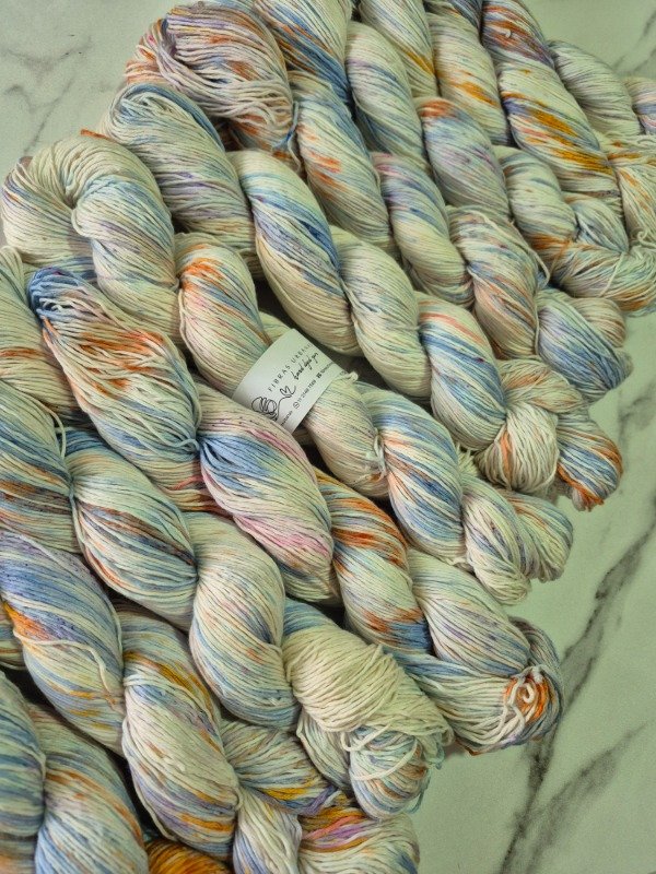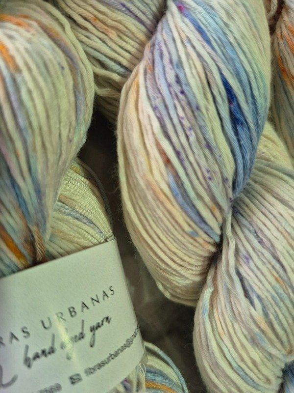 Esta base es un blem de 50 % fibra de algodón peinado y 50 % fibra de bamboo . Tiene una mano exquisita. Es fresca y brillosa a la vez. El algodón le otorga agarre y te permite fluir en el tejido mientras que el bamboo provee frescura, suntuosidad y brillo. Grosor fingering, 430 metros en 100 gramos.