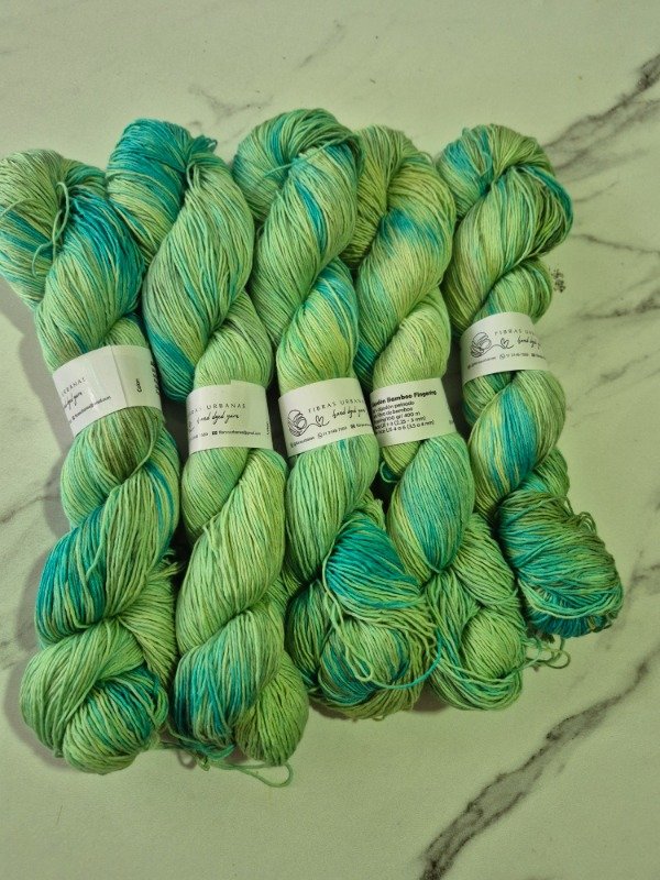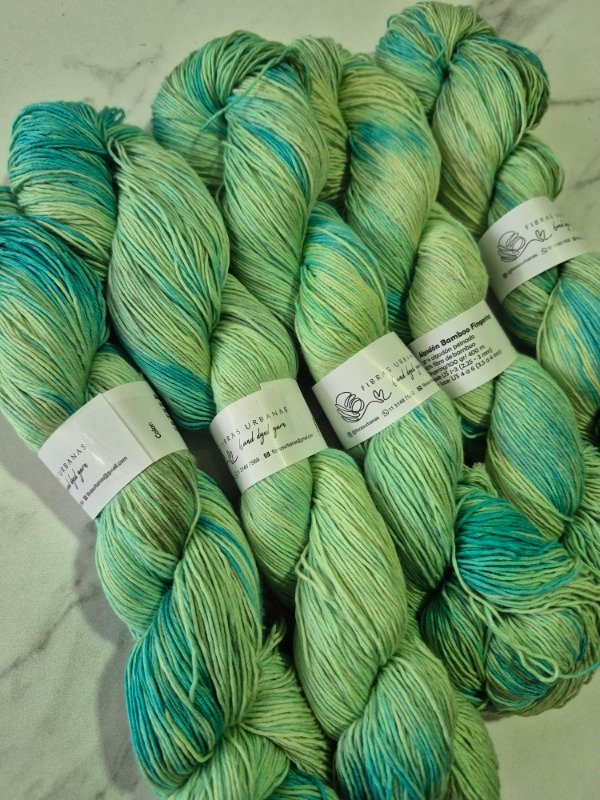 Esta base es un blem de 50 % fibra de algodón peinado y 50 % fibra de bamboo . Tiene una mano exquisita. Es fresca y brillosa a la vez. El algodón le otorga agarre y te permite fluir en el tejido mientras que el bamboo provee frescura, suntuosidad y brillo. Grosor fingering, 430 metros en 100 gramos.