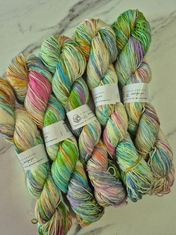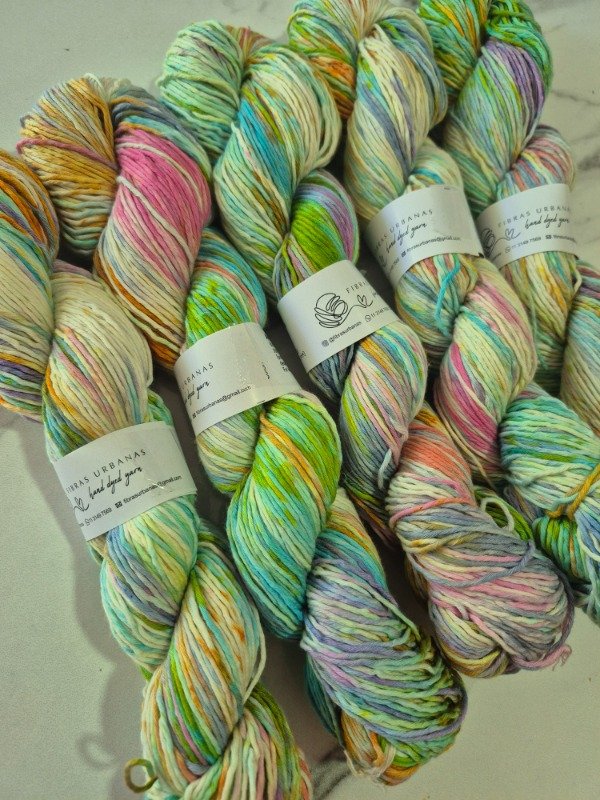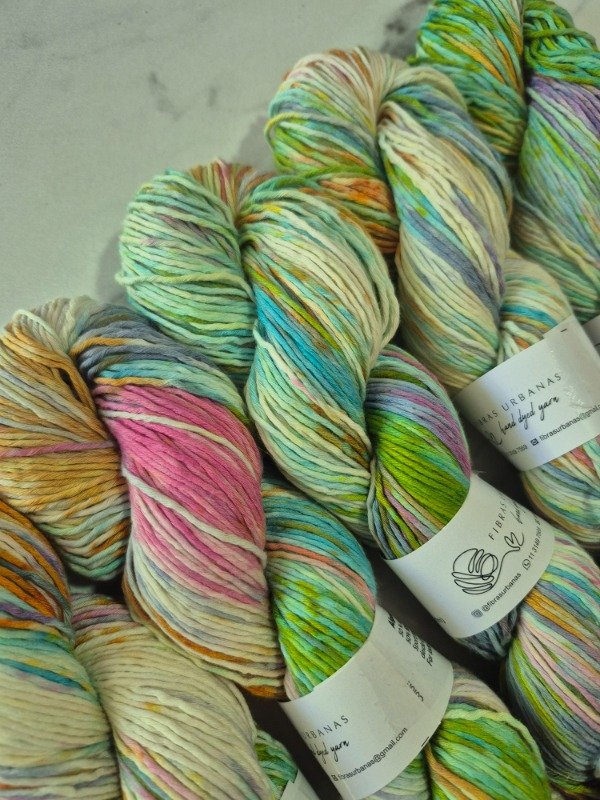 Esta base es un blem de 50 % fibra de algodón peinado y 50 % fibra de bamboo . Tiene una mano exquisita. Es fresca y brillosa a la vez. El algodón le otorga agarre y te permite fluir en el tejido mientras que el bamboo provee frescura, suntuosidad y brillo. Grosor sport 300 metros en 100 gramos.