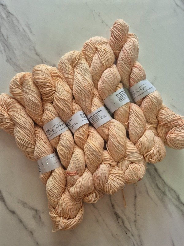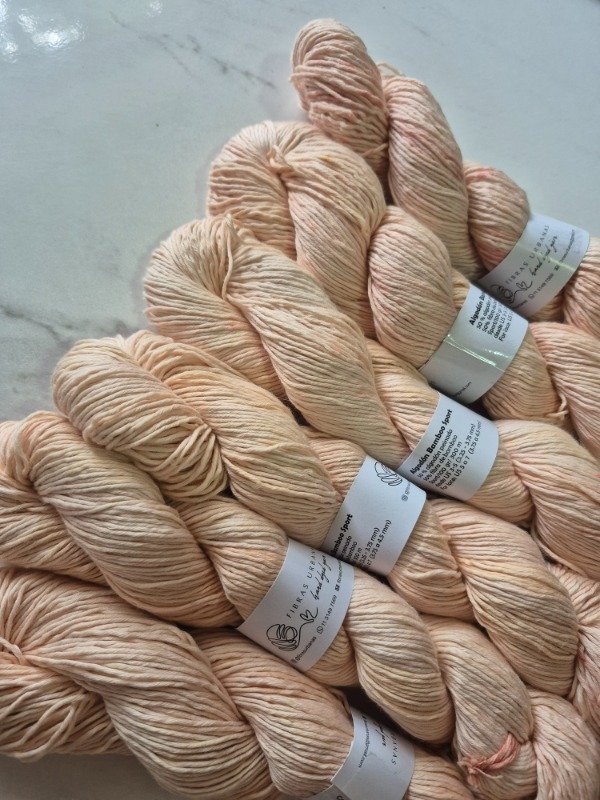 Esta base es un blem de 50 % fibra de algodón peinado y 50 % fibra de bamboo . Tiene una mano exquisita. Es fresca y brillosa a la vez. El algodón le otorga agarre y te permite fluir en el tejido mientras que el bamboo provee frescura, suntuosidad y brillo. Grosor sport 300 metros en 100 gramos.