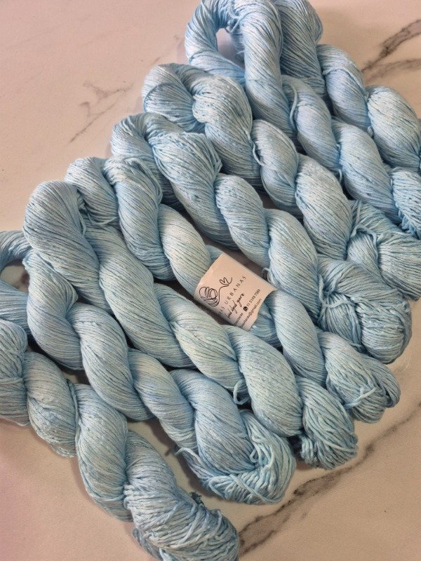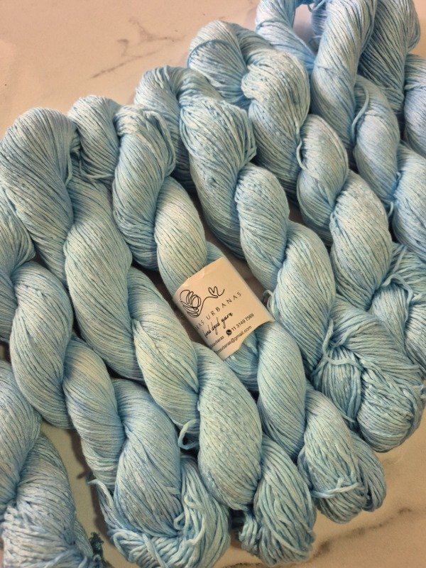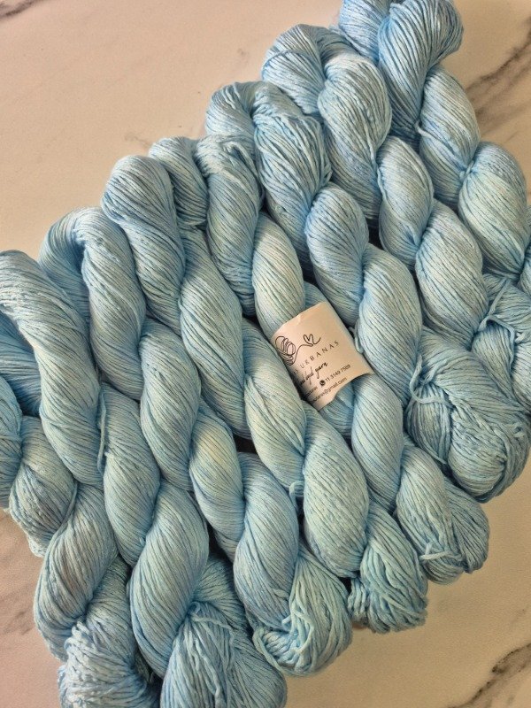 Hilado 100 % fibra de bamboo grosor sport. Rinde 300 metros en 100 gramos. El bamboo es una fibra premiun, de alta calidad. Es una fibra suntuosa, de muy buena caída y de gran transpirabilidad. Se destaca por su brillo y suavidad. Además, es respetuosa con el medio ambiente (su produccion insume menos litros que el algodón, por ejemplo), antibacteriana e hipoalergénica. Si vas a tejer bamboo por primera vez te recomiendo bajar el calibre de tus agujas ya sea de tricot o crochet ya que su contenido celulósico hace que estire por su propio peso. Y que tengas también esto en cuenta al estimar el largo de tus prendas. En fin si tejes tu prendas con facilidad negativa va a estirar con el uso pero te quedará al cuerpo. Espero te sirvan mis tips.