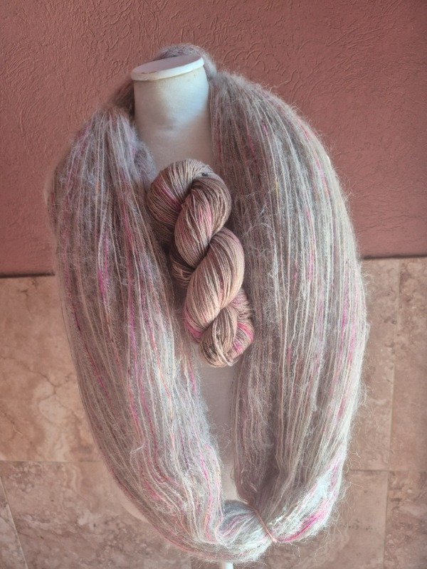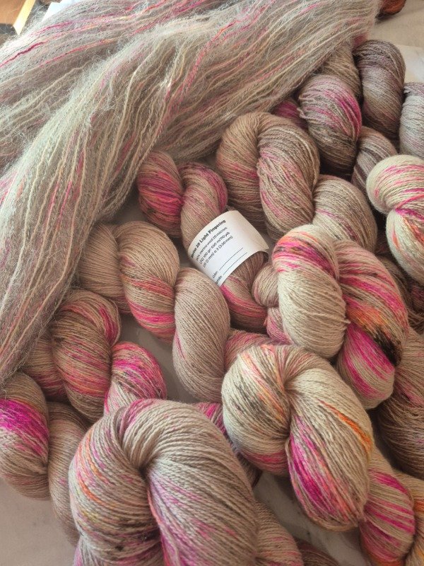 Este madejón está constituido por dos hebras, una de merino de 20 micras grosor light fingering, teñido artesanalmente y una hebra de mohair. El merino tiene un rendimiento de 650 metros en 100 gramos. Va acompañado de 2 madejas de mohair de 70 gramos que rinden 400 m cada una. Es decir que te alcanza para recorrer toda la madeja de merino y te sobra un poquito. Podes tejerlos con agujas 6 o 7 u 8 mm, según tu tensión y el nivel de abrigo que quieras obtener. Con un madejón te sale un sweater como el Ranunculus hasta talle M o un Kimono como el Altas Cumbres de Jessica Fernandez que es talle único con mangas globo. Para un tale XL o XXL te recomiendo 2 madejones.