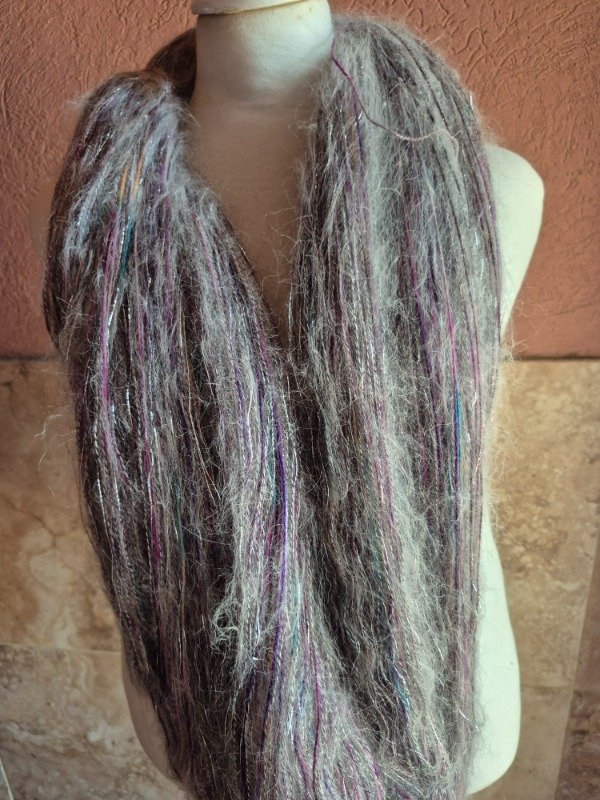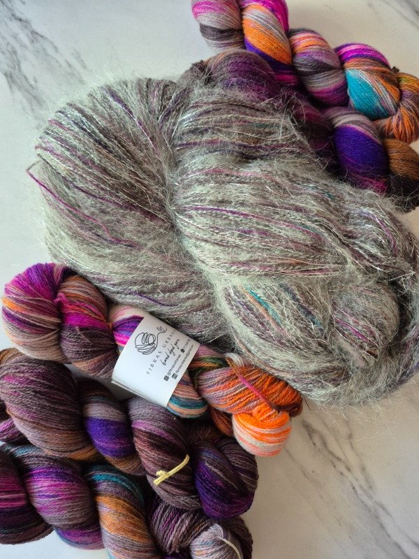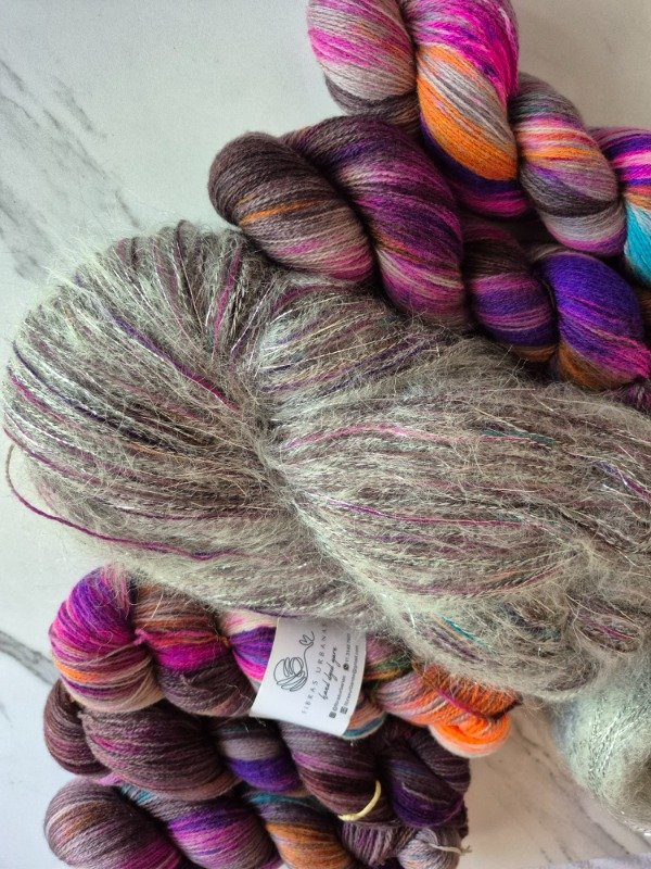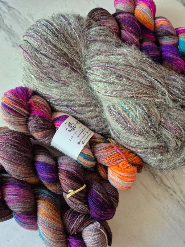 Este madejón está constituido por dos hebras, una de merino de 20 micras grosor light fingering, teñido artesanalmente y una hebra de mohair. El merino tiene un rendimiento de 650 metros en 100 gramos. Va acompañado de 2 madejas de mohair de 70 gramos que rinden 400 m cada una. Es decir que te alcanza para recorrer toda la madeja de merino y te sobra un poquito. Podes tejerlos con agujas 6 o 7 u 8 mm, según tu tensión y el nivel de abrigo que quieras obtener. Con un madejón te sale un sweater como el Ranunculus hasta talle M o un Kimono como el Altas Cumbres de Jessica Fernandez que es talle único con mangas globo. Para un tale XL o XXL te recomiendo 2 madejones.