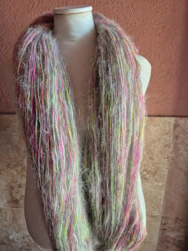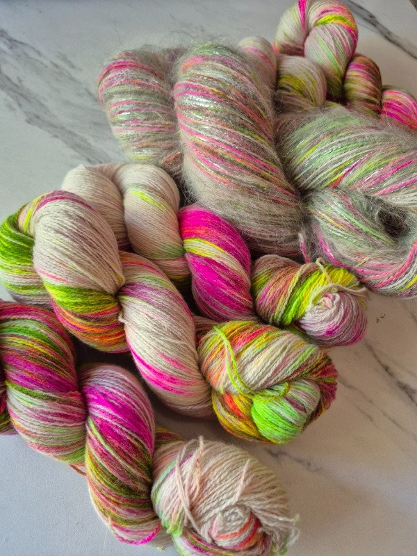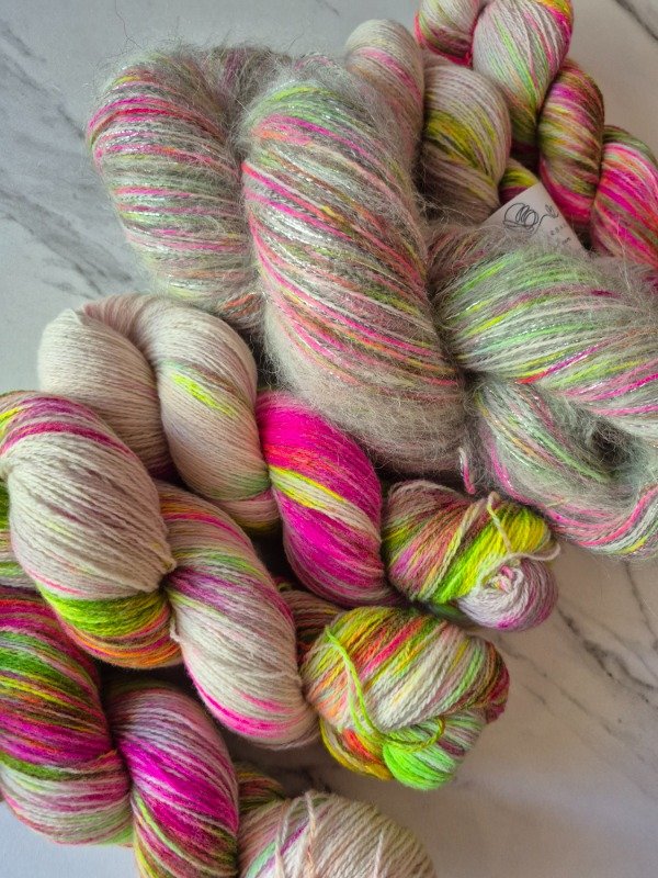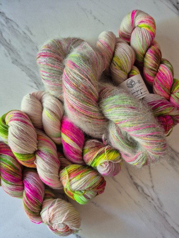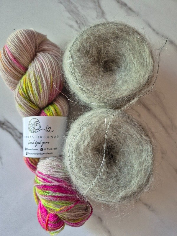 Este madejón está constituido por dos hebras, una de merino de 20 micras grosor light fingering, teñido artesanalmente y una hebra de mohair. El merino tiene un rendimiento de 650 metros en 100 gramos. Va acompañado de 2 madejas de mohair de 70 gramos que rinden 400 m cada una. Es decir que te alcanza para recorrer toda la madeja de merino y te sobra un poquito. Podes tejerlos con agujas 6 o 7 u 8 mm, según tu tensión y el nivel de abrigo que quieras obtener. Con un madejón te sale un sweater como el Ranunculus hasta talle M o un Kimono como el Altas Cumbres de Jessica Fernandez que es talle único con mangas globo. Para un tale XL o XXL te recomiendo 2 madejones.