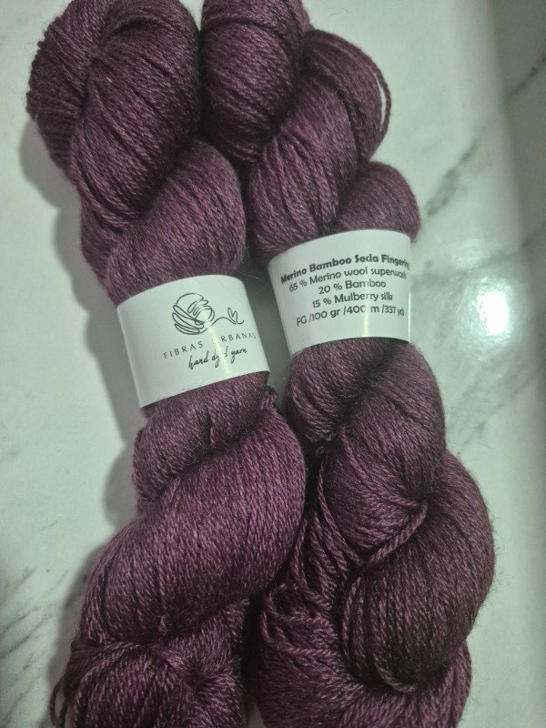 65 % merino superwash 20% bamboo 15% seda mulberry. Grosor fingering:100 gramos/ 400 metros.