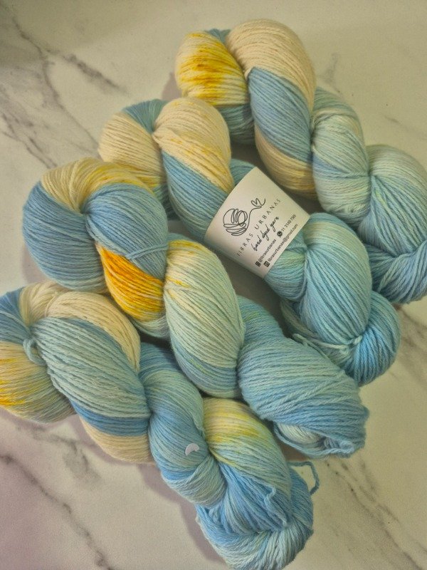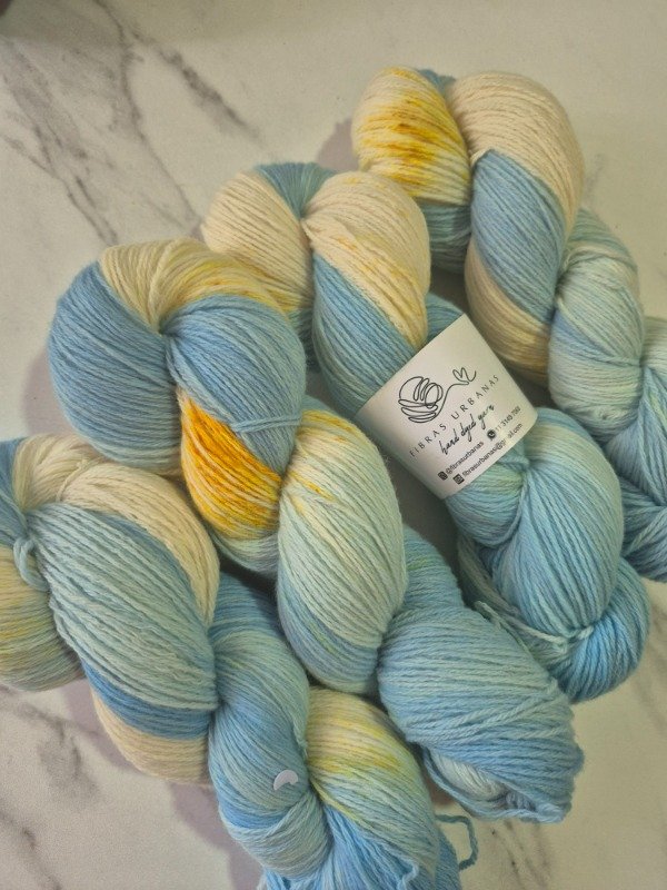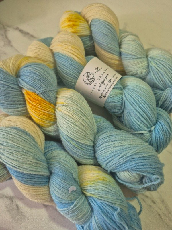 Esta base es un merino patagónico de 20 micras, muy suave. Puede ser usado en contacto con la piel como primera capa. El grosor fingering rinde 430 metros en 100 gramos. Esta suavemente torsionado en tres cabos. Puede ser tejido sólo con agujas 3 a 3.5 mm o acompañando otra fibra, como el mohair, con agujas 6 a 8 mm según tu tensión y el efecto que quieras lograr. Las madejas de Punto Asignado son madejas teñidas una por una. Pueden ser de colores contrastantes o no, pueden tener speckles o no... pero siempre vas a encontrar un tramo largo de un color, un aviso, un tramo corto de otro color. Cuando llega el aviso te preparas para el cambio de color. Lo realizas cuando llega el otro color. Podes tejer libre o seguir un patrón. Que seas feliz tejiendo. Si queres experimentar con esta técnica @cecipaterno tiene en su tienda el chal Peperina.