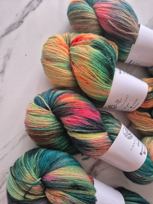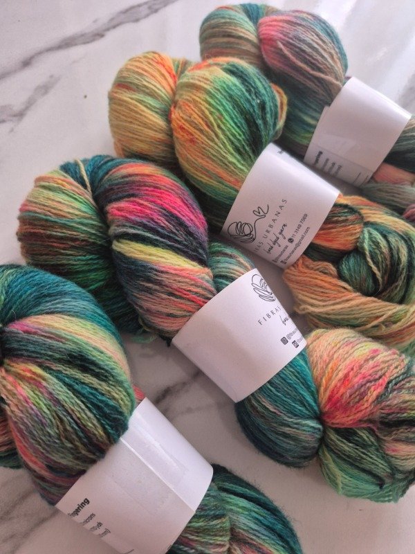 Esta base es un merino patagónico de 20 micras, muy suave. Puede ser usado en contacto con la piel como primera capa. El grosor light fingering rinde 650 metros en 100 gramos. Esta suavemente torsionado en dos cabos. Puede ser tejido sólo con agujas 2.5 a 3.5 mm o acompañando otra fibra, como el mohair, con agujas 6 a 7 mm según tu tensión y el efecto que quieras lograr. Por su gran rendimiento usado de esta manera, acompañando un mohair, con una madeja podés tejer un chaleco y con dos un sweater.
