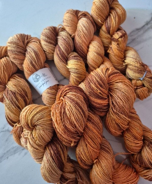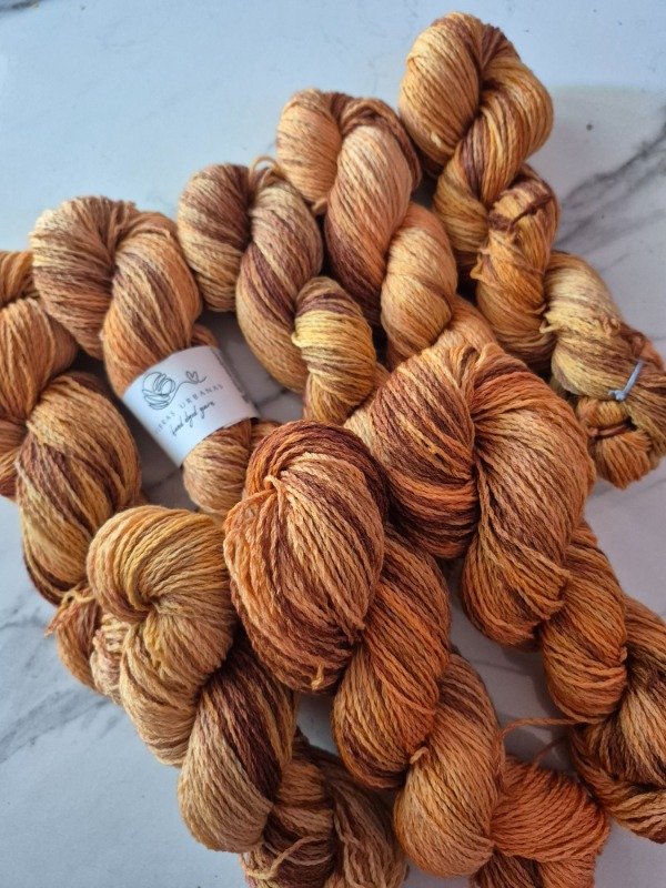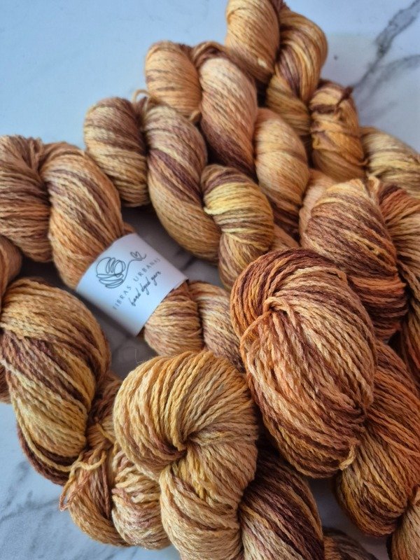 Urbana DK, es una base de puro merino, suave, son 8 cabos torsionados juntos, con un tratamiento superwash, lo que le brinda un brillo extraordinario y suma durabilidad. Es ideal para todo tipo de prendas. Desde un cuello hasta un sweater. Como todas las madejas teñidas a mano, cada madeja es única, por eso te recomiendo que alternes las madejas cuando vas tejiendo, ya que al ser tintes realizados a mano puede haber variaciones entre una madeja y otra.