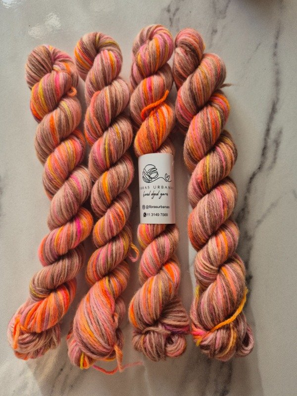 Esta base es un merino patagónico de 20 micras, muy suave. Puede ser usado en contacto con la piel como primera capa. El grosor fingering rinde 430 metros en 100 gramos. Esta suavemente torsionado en tres cabos. Puede ser tejido sólo con agujas 3 a 3.5 mm o acompañando otra fibra, como el mohair, con agujas 6 a 8 mm según tu tensión y el efecto que quieras lograr. Presentación de mini madejas por 25 gramos y 108 metros
