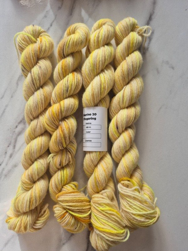 Esta base es un merino patagónico de 20 micras, muy suave. Puede ser usado en contacto con la piel como primera capa. El grosor fingering rinde 430 metros en 100 gramos. Esta suavemente torsionado en tres cabos. Puede ser tejido sólo con agujas 3 a 3.5 mm o acompañando otra fibra, como el mohair, con agujas 6 a 8 mm según tu tensión y el efecto que quieras lograr. Presentación de mini madejas por 25 gramos y 108 metros