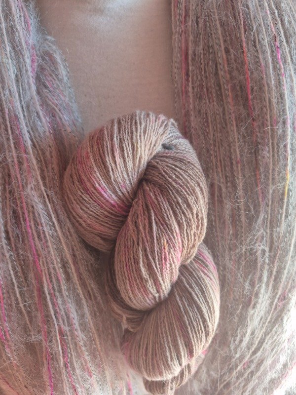 Este madejón está constituido por dos hebras, una de merino de 20 micras grosor light fingering, teñido artesanalmente y una hebra de mohair. El merino tiene un rendimiento de 650 metros en 100 gramos. Va acompañado de 2 madejas de mohair de 70 gramos que rinden 400 m cada una. Es decir que te alcanza para recorrer toda la madeja de merino y te sobra un poquito. Podes tejerlos con agujas 6 o 7 u 8 mm, según tu tensión y el nivel de abrigo que quieras obtener. Con un madejón te sale un sweater como el Ranunculus hasta talle M o un Kimono como el Altas Cumbres de Jessica Fernandez que es talle único con mangas globo. Para un tale XL o XXL te recomiendo 2 madejones.