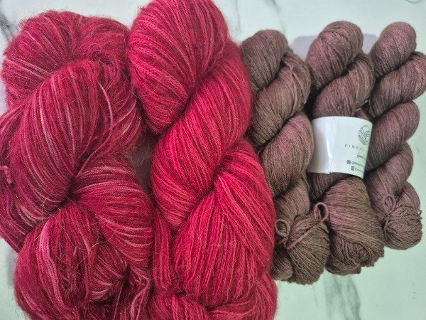 Este madejón está constituido por dos hebras, una de merino de 20 micras grosor light fingering, teñido artesanalmente y una hebra de mohair. El merino tiene un rendimiento de 650 metros en 100 gramos. Y en el caso del mohair crudo va acom0añado de 2 madejas de mohair de 70 gramos que rinden 400 mwtros cada una. Es decir que te alcanza para recorrer toda la madeja de merino y te sobra un poquito. Podes tejerlos con agujas 6 o 7 u 8 mm. Segun tu tensión y el nivel de abrigo que quieras obtener. Con un madejón te sale un sweater como el Ranunculus hasta talla 120 cm de busto o un Kimono como el Altas Cumbres de Jessica Fernandez que es talle único con mangas globo. Para un tale XL o XXL te recomiendo 2 madejones. Este pack incluye 2 madejones color rojo y 3 madejas de merino 19 fingering, edición 2026, color marrón chocolate.