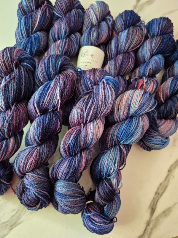 Urbana DK, es una base de puro merino, suave, son 8 cabos torsionados juntos, con un tratamiento superwash, lo que le brinda un brillo extraordinario y suma durabilidad. Es ideal para todo tipo de prendas. Desde un cuello hasta un sweater. Como todas las madejas teñidas a mano, cada madeja es única, por eso te recomiendo que alternes las madejas cuando vas tejiendo, ya que al ser tintes realizados a mano puede haber variaciones entre una madeja y otra.