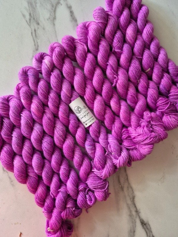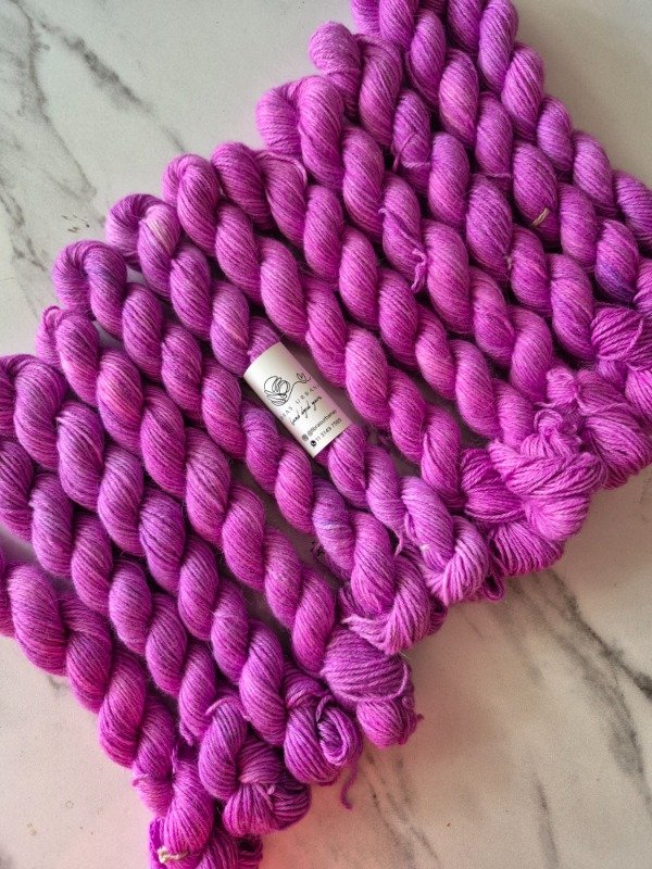 Esta es una base de media estación, extremadamente suave al tacto y con cierto brillo y caída, propio de la mezcla con fibra de viscosa. Es un blend compuesto por 30% de pelo de conejo de angora, 40% fibra de viscosa, y 30 % de poliamida que le otorga elasticidad, suavidad y durabilidad. Es una de mis fibras preferidas a la hora de teñir por la manera como toman los colores. El grosor fingering tiene un excelente rendimiento, 433 metros en 100 gramos. Por lo que las mini madejitas de 25 gramos rinden 108 metros aproximadamente y son una excelente opción para tus proyectos con colorwork.