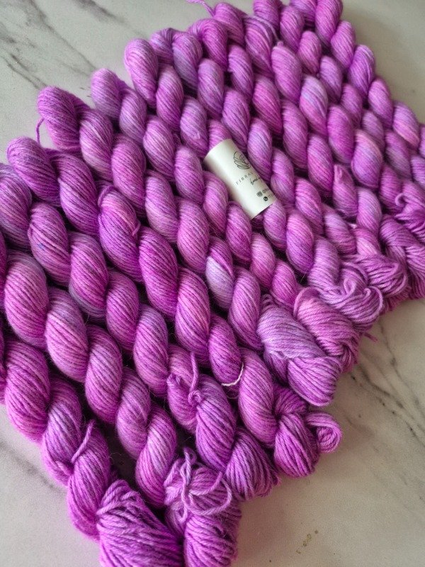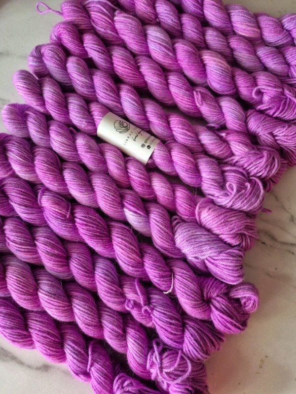 Esta es una base de media estación, extremadamente suave al tacto y con cierto brillo y caída, propio de la mezcla con fibra de viscosa. Es un blend compuesto por 30% de pelo de conejo de angora, 40% fibra de viscosa, y 30 % de poliamida que le otorga elasticidad, suavidad y durabilidad. Es una de mis fibras preferidas a la hora de teñir por la manera como toman los colores. El grosor fingering tiene un excelente rendimiento, 433 metros en 100 gramos. Por lo que las mini madejitas de 25 gramos rinden 108 metros aproximadamente y son una excelente opción para tus proyectos con colorwork.