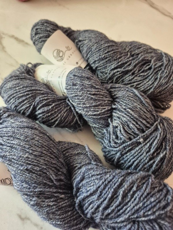 Esta base es un mix de lana y poliamida. Lo que le da el aspecto de un hilado tweed. En este caso, debes tener en cuenta que no es lana merino, sino lana de nuestras Pampas. No es para usar como primera piel. Pero si te la recomiendo para sweaters, pullovers y cardigans. Para todo tipo de ropa de abrigo. Vas a encontrar múltiples colores sólidos y mini madejas para tejer colorwork, si fuera tu elección. Su composición es 60% lana y 40 % poliamida. Es un título 2/7, cuenta con 12 a 13 wpi. Rinde 350 metros en 100 gramos. Es decir que es un fingering pesado. La vas a encontrar en la sección oulet porque hay una cantidad limitada de madejas que iré tiñendo hasta agotar stock. Presentación es por madejas de 100 gramos.