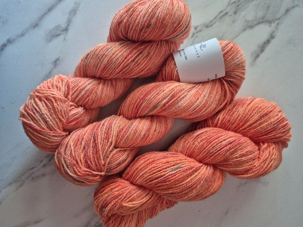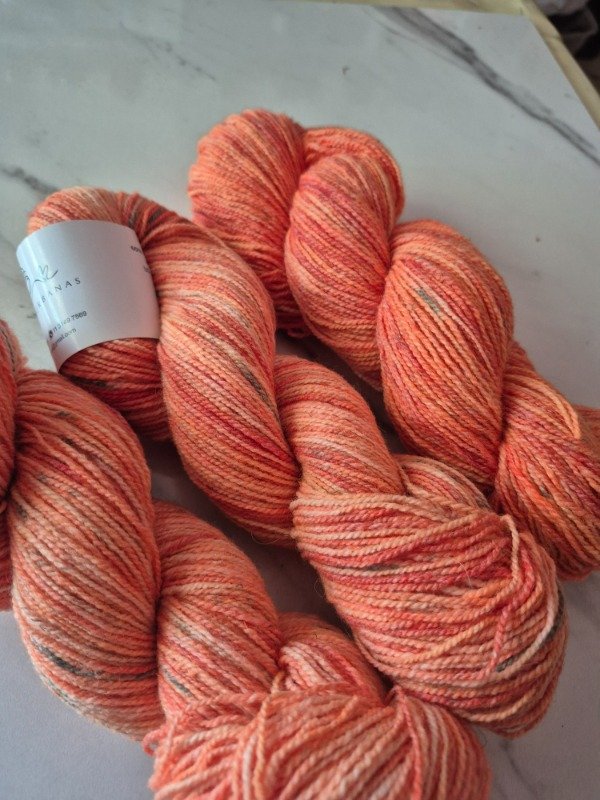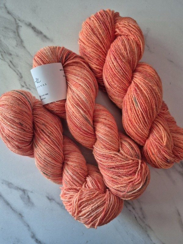 Esta base es un mix de lana y poliamida. Lo que le da el aspecto de un hilado tweed. En este caso, debes tener en cuenta que no es lana merino, sino lana de nuestras Pampas. No es para usar como primera piel. Pero si te la recomiendo para sweaters, pullovers y cardigans. Para todo tipo de ropa de abrigo. Vas a encontrar múltiples colores sólidos y mini madejas para tejer colorwork, si fuera tu elección. Su composición es 60% lana y 40 % poliamida. Es un título 2/7, cuenta con 12 a 13 wpi. Rinde 350 metros en 100 gramos. Es decir que es un fingering pesado. La vas a encontrar en la sección oulet porque hay una cantidad limitada de madejas que iré tiñendo hasta agotar stock. Presentación es por madejas de 100 gramos.