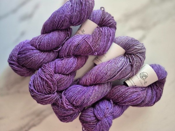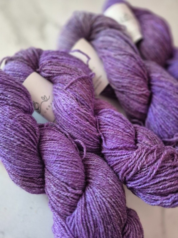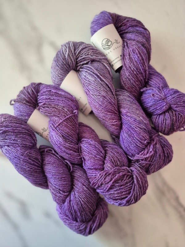 Esta base es un mix de lana y poliamida. Lo que le da el aspecto de un hilado tweed. En este caso, debes tener en cuenta que no es lana merino, sino lana de nuestras Pampas. No es para usar como primera piel. Pero si te la recomiendo para sweaters, pullovers y cardigans. Para todo tipo de ropa de abrigo. Vas a encontrar múltiples colores sólidos y mini madejas para tejer colorwork, si fuera tu elección. Su composición es 60% lana y 40 % poliamida. Es un título 2/7, cuenta con 12 a 13 wpi. Rinde 350 metros en 100 gramos. Es decir que es un fingering pesado. La vas a encontrar en la sección oulet porque hay una cantidad limitada de madejas que iré tiñendo hasta agotar stock. Presentación es por madejas de 100 gramos.